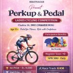 बिराटनगर । माडवारी महिला मंच तथा माडवारी युवती मंचको संयुक्त आयोजनामा बिराटनगरमा महिलाहरूका लागि साइक्लिङ प्रतियोगिता आयोजना हुने भएको छ। “Perkup & Pedal” शीर्षकमा आयोजना हुन लागेको Ladies Cycling Competition आगामी चैत १४ गते (२८ मार्च २०२६) मा सञ्चालन हुने आयोजकले जनाएको छ। प्रतियोगितामा १५ वर्षभन्दा माथिका महिलाहरूले सहभागिता जनाउन सक्नेछन्। स्वास्थ्य र आत्मविश्वास अभिवृद्धि